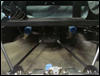 The following pictures will share some of the steps taken to date and the associated results as we methodically integrate the new independent quick change rear end. We have completed the dry fitting of the custom independent quick change rear end assembly, located and secured the pinion support bars and the lower radius bars. We created and fabricated a custom front radius bar bracket that has the center pivot point of the bars located in line with the custom independent quick change rear end's lower control arm pivot point/through bolt and have been placed at the same height as the lower control arm pivot point/bolt so as to insure that the radius bars will work in concert with the lower control arms with no binding such as pushing or pulling as the control arms move up and down effectively creating two large control arms.